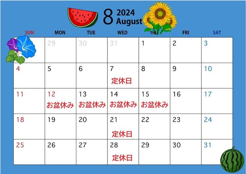 8月 営業日のお知らせ